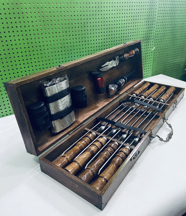 Чудовий подарунок для чоловіка. Набір для пікніка "Кемпінг". Шампури та інші корисні речі для відпочинку та пікніка в дерев'яному кейсі ручної роботи. З флягою та рюмками в чохлі.